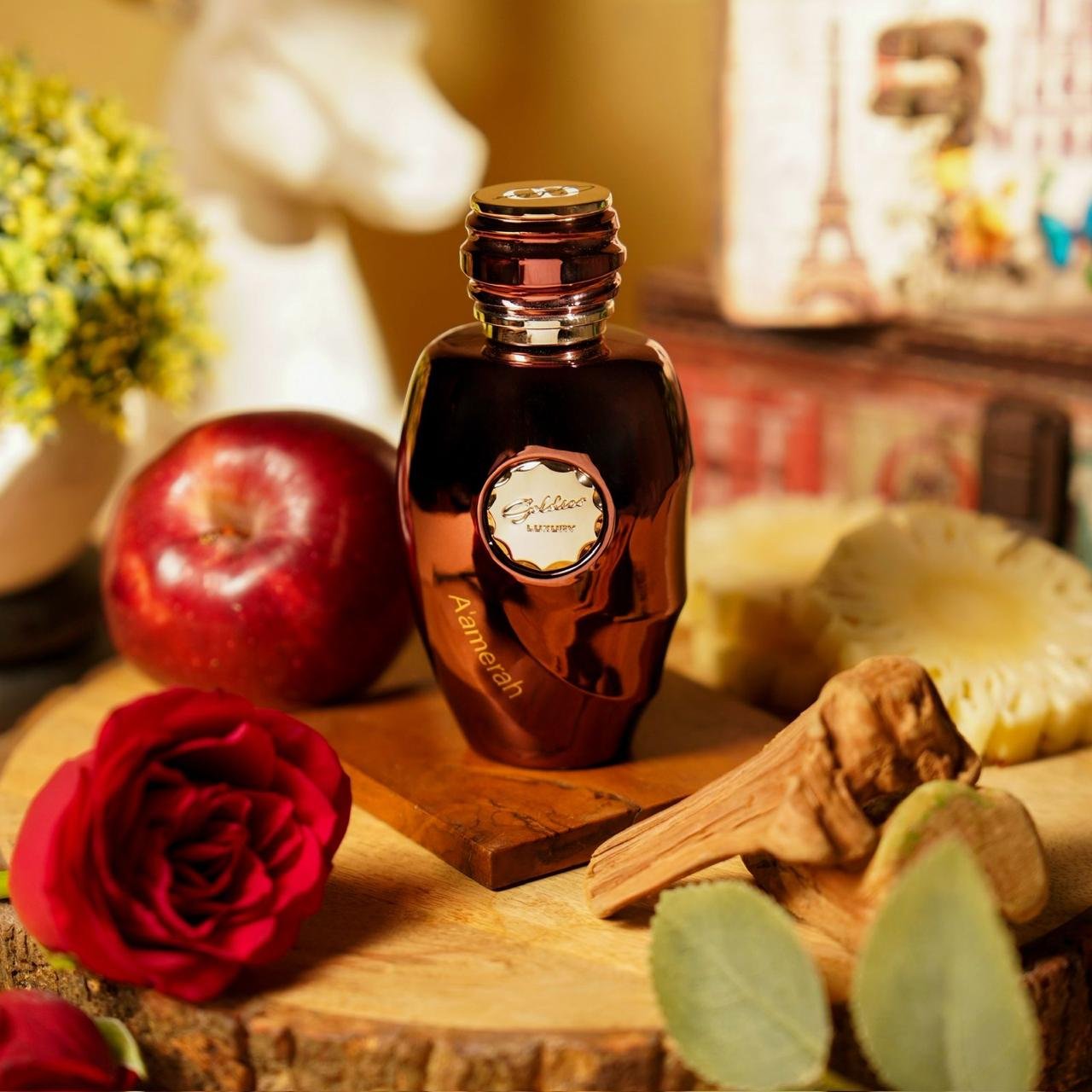 The base unfolds into deep woody notes layered with wild rose, patchouli, and musk, creating a scent that feels grounded, refined, and lasting.