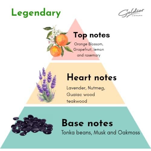Top Note: Orange Blossom, Grapefruit, Lemon and Rosemary; Middle Notes: are Lavender, Nutmeg, Guaiac Wood, Teak Wood; Base Notes: are Tonka Bean, Musk and Oakmoss.